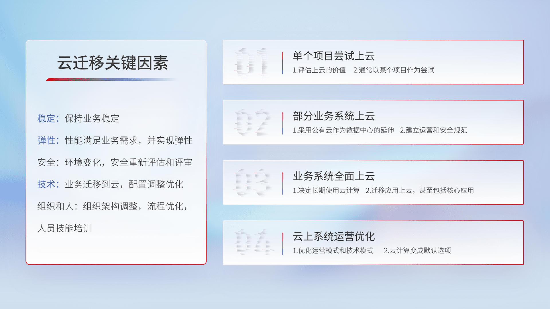 结合实际业务,,,,从规划设计、、、云平台选型、、云原生改造、、、数据迁移、、、集成交付,,,,迁移全过程为客户识别最佳上云路径,,,做好风险识别管理,,设计网络架构、、、身份权限、、、安全审计合规、、、操作审计、、、日志审计、、、监控告警策略、、、、多站点容灾设计等,,对云上基础设施进行整体规划,,,,提升IT治理水平,,,以满足弹性、、高可用、、、高性能的需求。。。