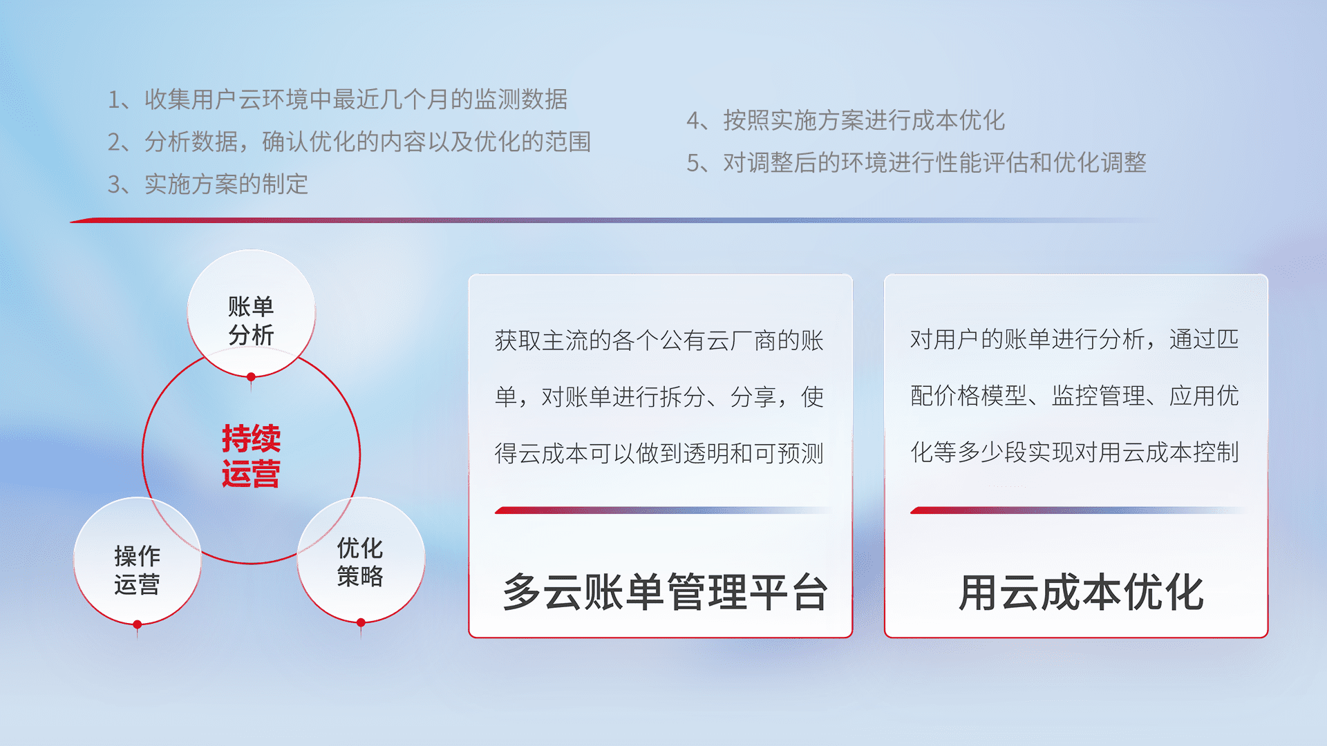 通过多云纳管,,,,以统一的资源数据模型把客户的云资源进行抽象和封装,,,,进而实现对多云资源的统一操作,,保障云资源管理的可靠性、、、稳定性与可用性。。。量身定制化运维内容,,,,配置、、开发运维、、、补丁管理、、、备份、、、、监控、、、、认证和访问管理、、、审计和日常巡检等,,,保障在用云过程中的可靠度,,,稳定度以及高可用率。。。